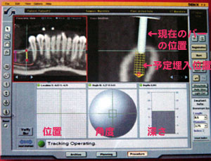 下の3つのウィンドーにはバーの現在および理想的な位置・角度・深さが示されています。このガイドから外れないように治療が進行されれば、寸分の狂い無く理想的な位置にインプラントが埋入されます。