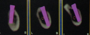 右下の写真はアゴの骨の断面図を示しています。同様にオレンジ色がアゴの神経の位置、紫色がインプラントの予定位置です。アゴの神経を損傷することなく、インプラントが植立出来るのが分かります。
