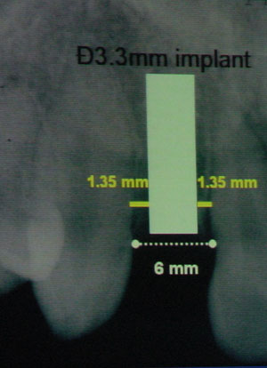 右の写真は右上の側切歯(前から2番目の歯)が無くなっているケースです。歯と歯との間の幅は6mmです。一番径の細いインプラントの幅は3.3mmです。そのため隣在歯を傷つけないようにするには、正確に中央にインプラントを埋入しなくてはなりません。左右のマージンはそれぞれ1.35mmしかありません。