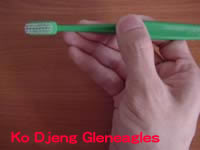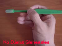 歯ブラシを握る場所は、なるべくブラシに近いところを持っていただいた方が、動きが正確にかつ細かくすることが出来ます。奥歯の方では手がじゃまにならないようブラシから手を遠ざけますが、なるべくブラシに近い部分を持って細かい動きが出来るようにしてください。